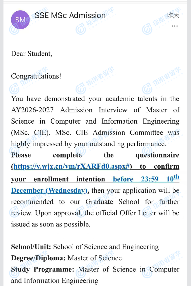 香港中文大學(xué)計(jì)算機(jī)與信息工程理學(xué)碩士(CUHK-Shenzhen)研究生offer一枚