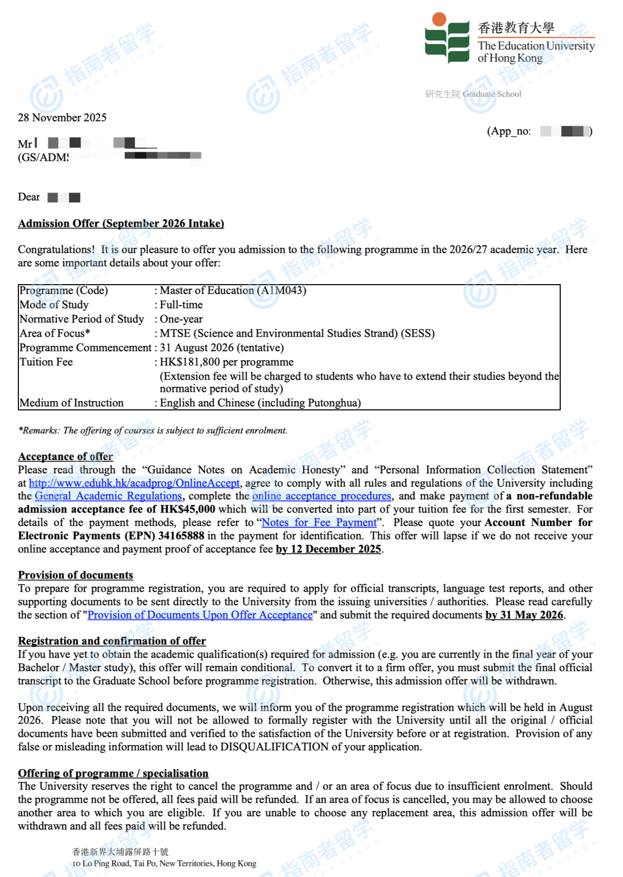 香港教育大學(xué)教育學(xué)碩士研究生offer一枚