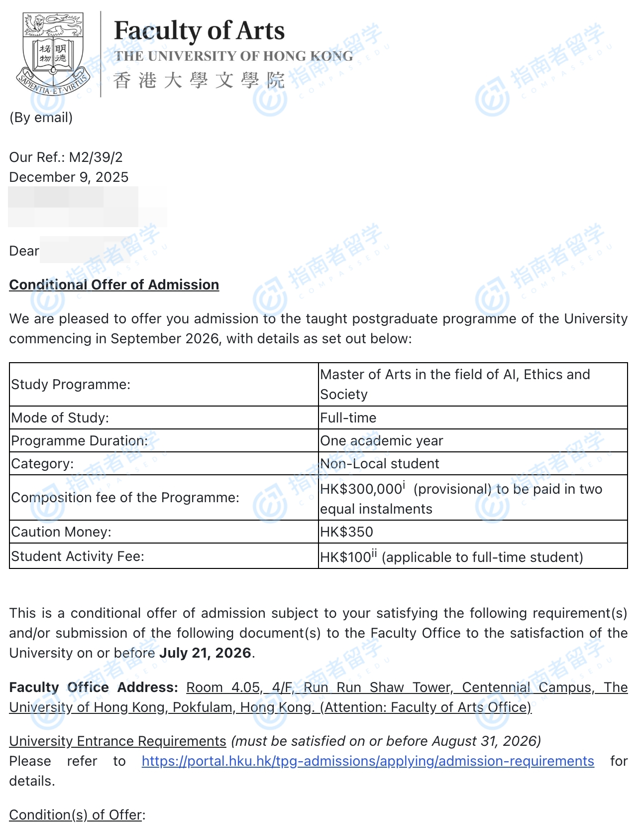 香港大學(xué)人工智能、倫理與社會文學(xué)碩士研究生offer一枚
