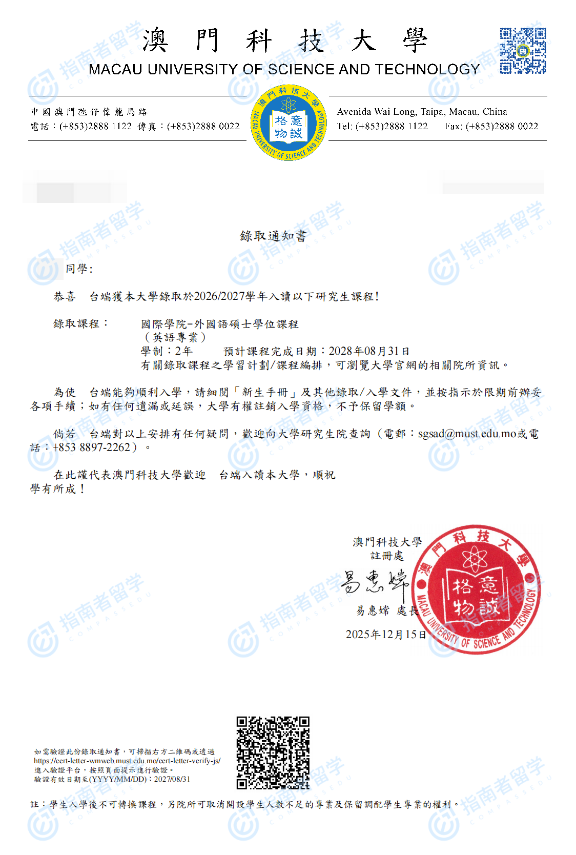 澳門科技大學(xué)外國(guó)語(yǔ)碩士研究生offer一枚