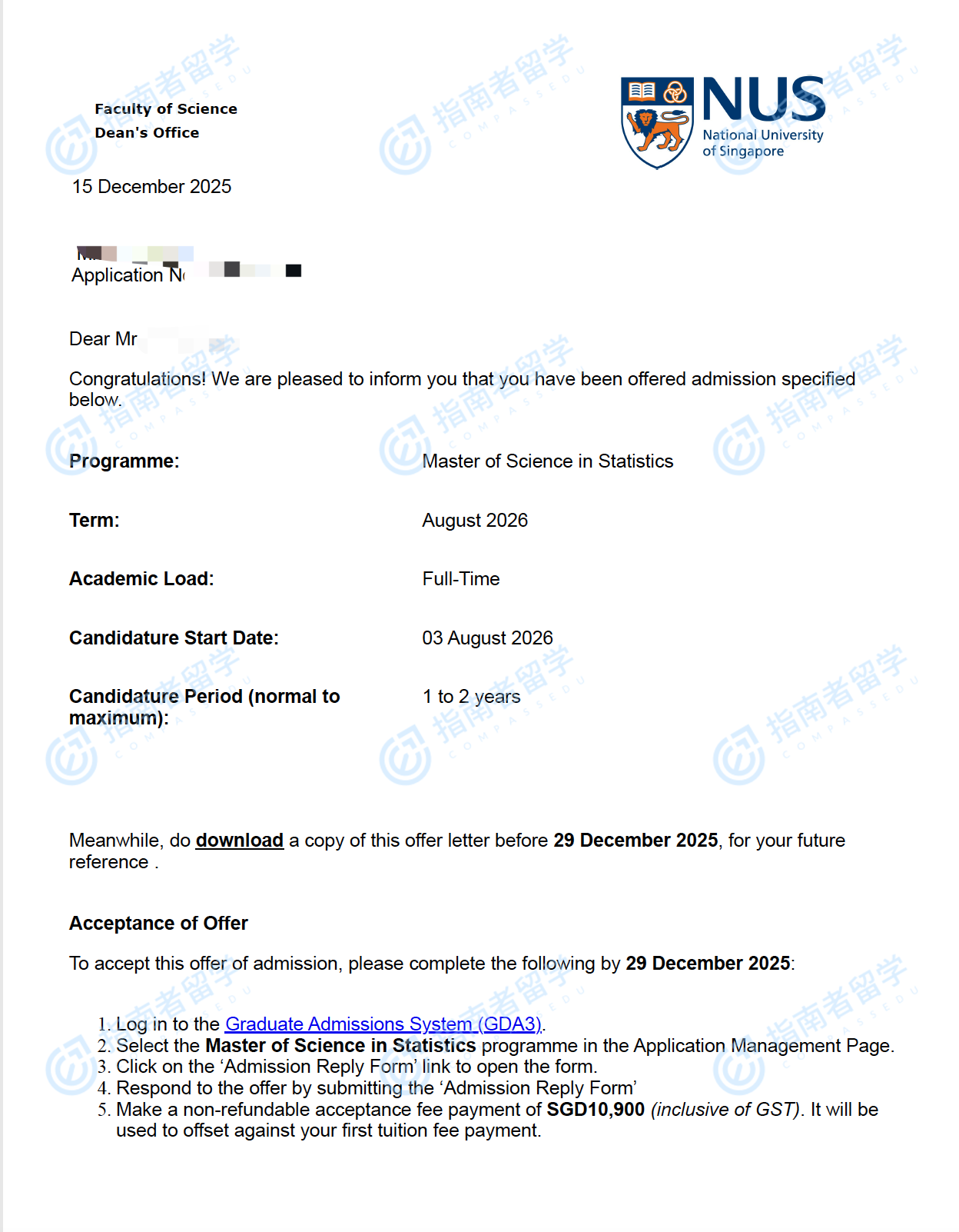 新加坡國(guó)立大學(xué)統(tǒng)計(jì)學(xué)理學(xué)碩士研究生offer一枚