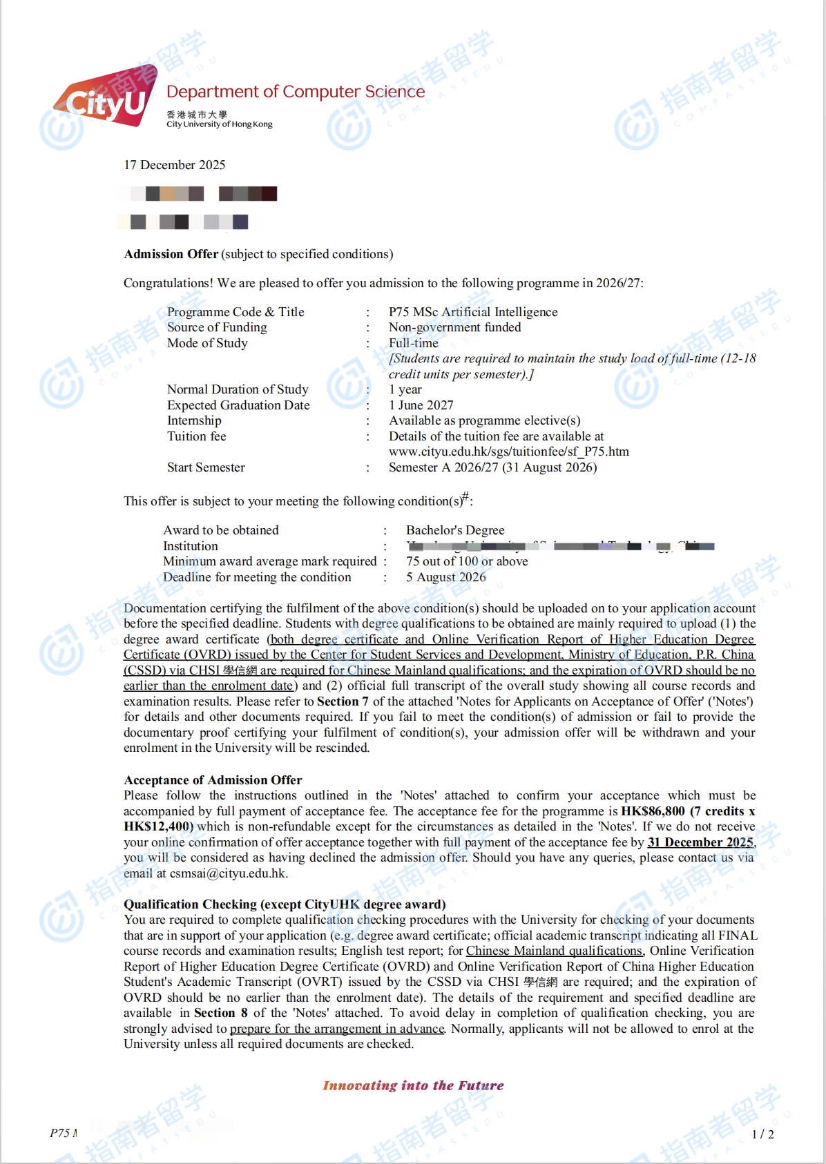 香港城市大學(xué)人工智能理學(xué)碩士研究生offer一枚