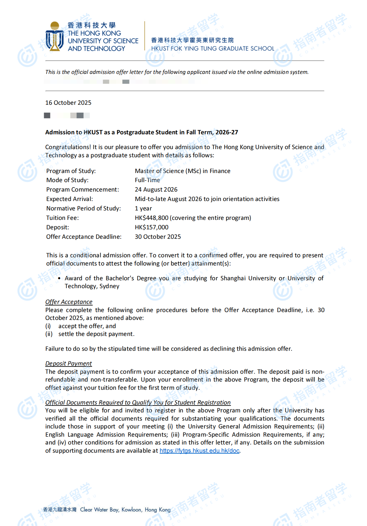 香港科技大學(xué)金融學(xué)理學(xué)碩士研究生offer一枚