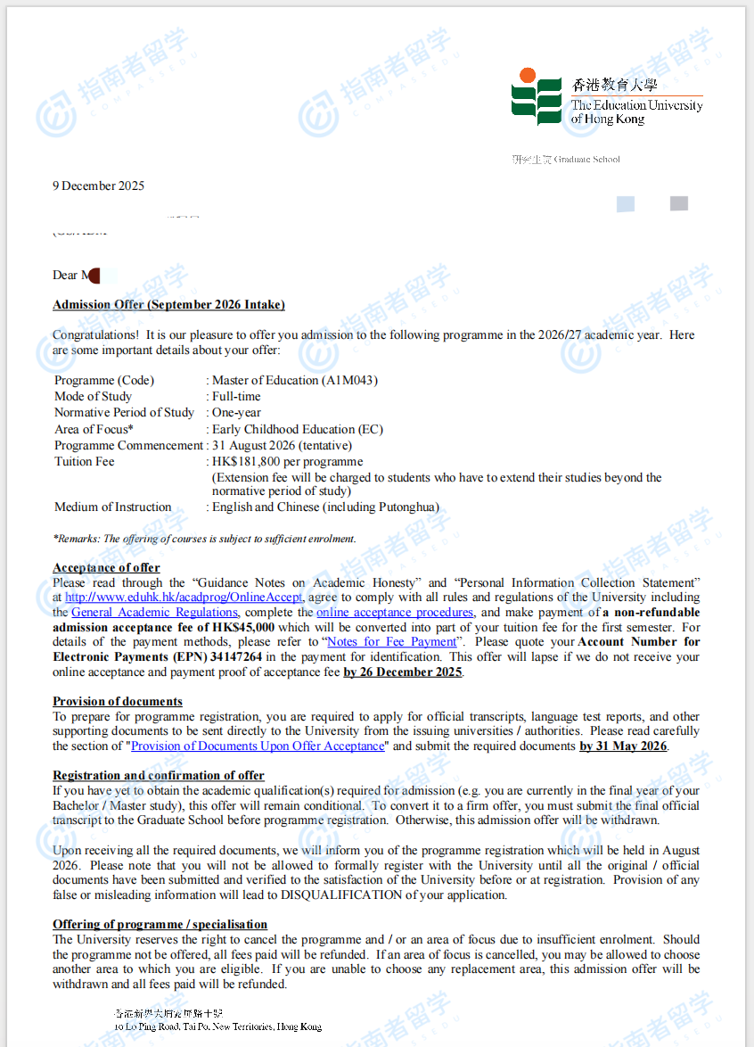 香港教育大學(xué)教育學(xué)碩士研究生offer一枚