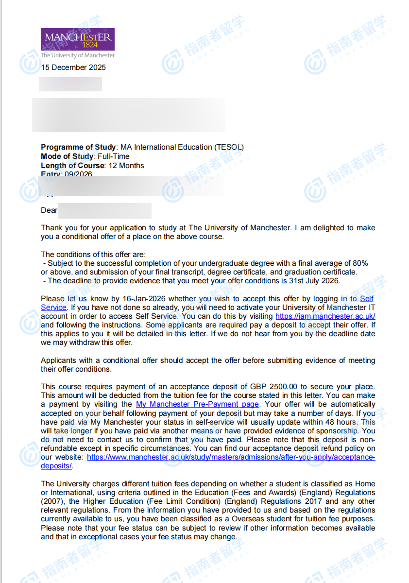 曼徹斯特大學國際教育(對外英語教學)文學碩士研究生offer一枚