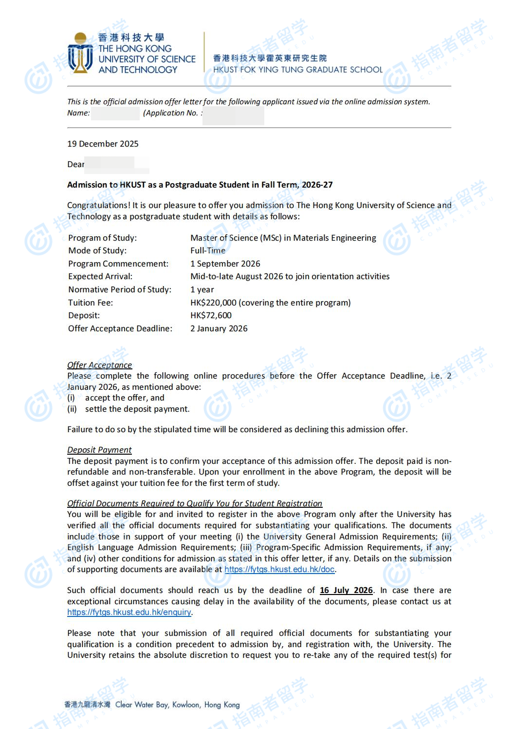 香港科技大學(xué)材料工程理學(xué)碩士研究生offer一枚