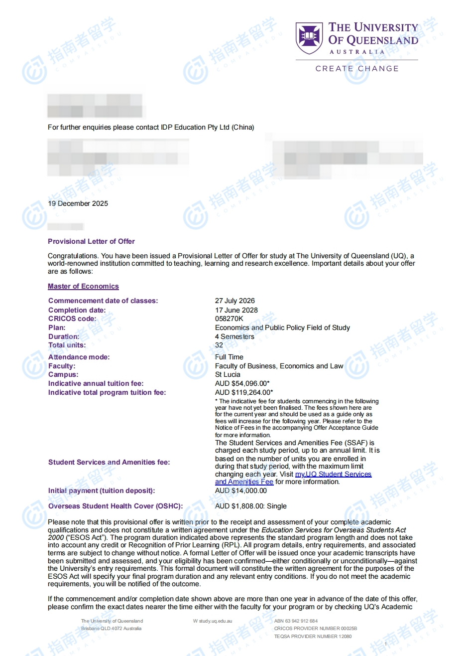 昆士蘭大學(xué)經(jīng)濟(jì)學(xué)碩士(2年制)研究生offer一枚
