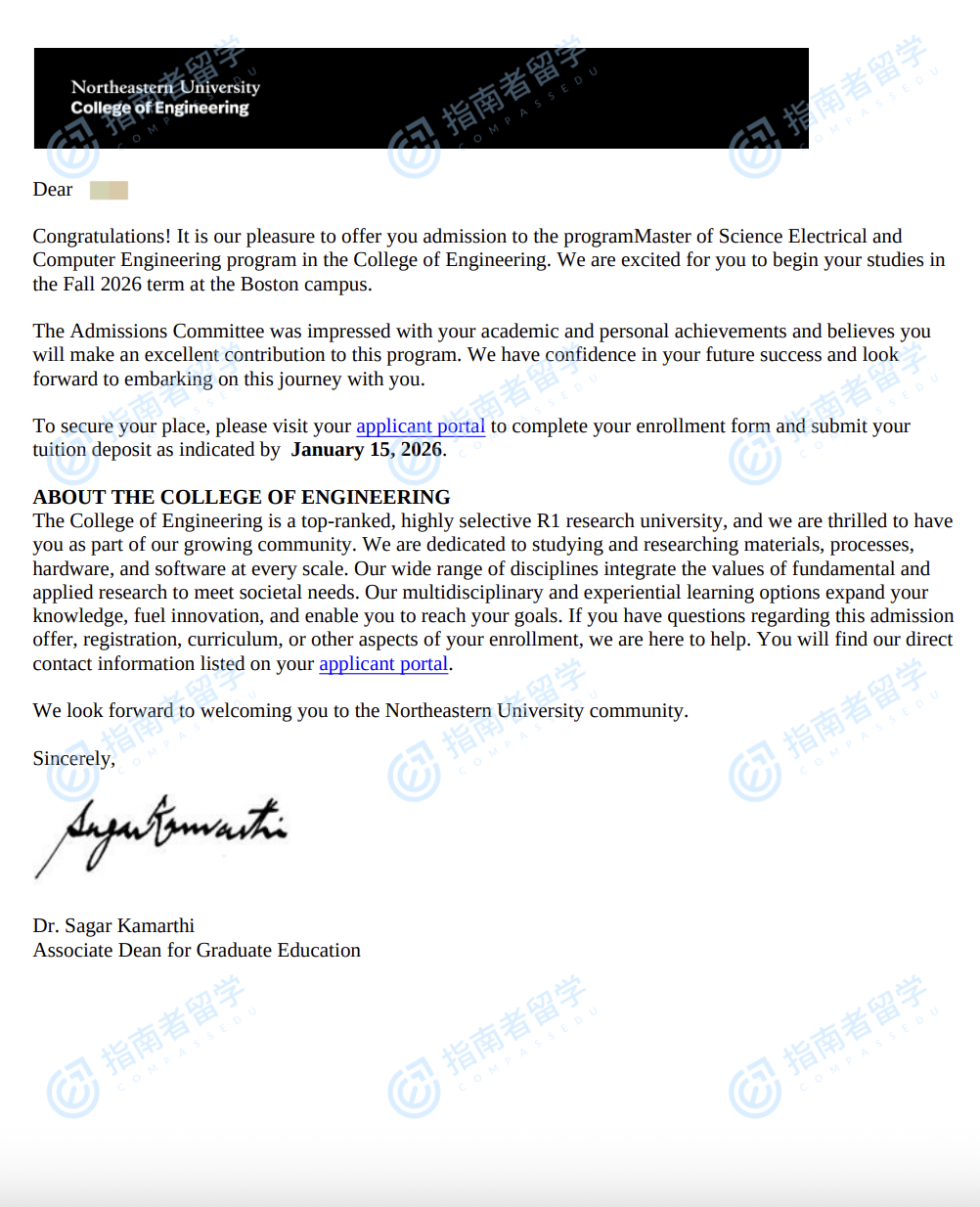 東北大學(xué)(美國(guó))電氣與計(jì)算機(jī)工程碩士研究生offer一枚