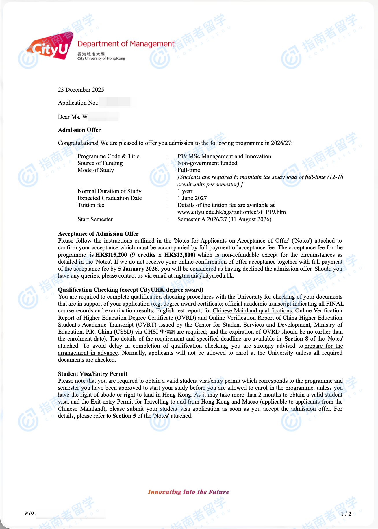 香港城市大學(xué)管理與創(chuàng)新理學(xué)碩士研究生offer一枚