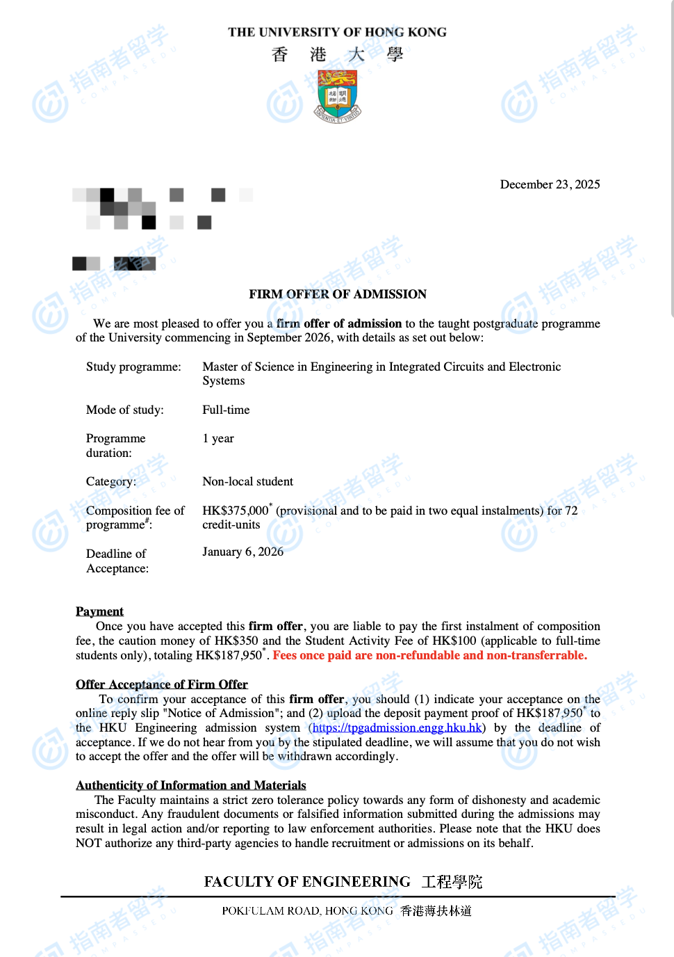 香港大學集成電路與電子系統(tǒng)(工程)理學碩士研究生offer一枚