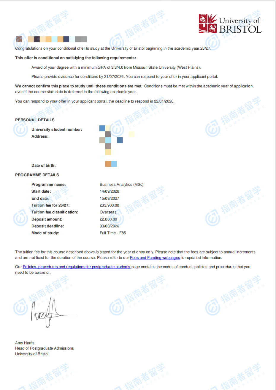 布里斯托大學(xué)商業(yè)分析理學(xué)碩士研究生offer一枚