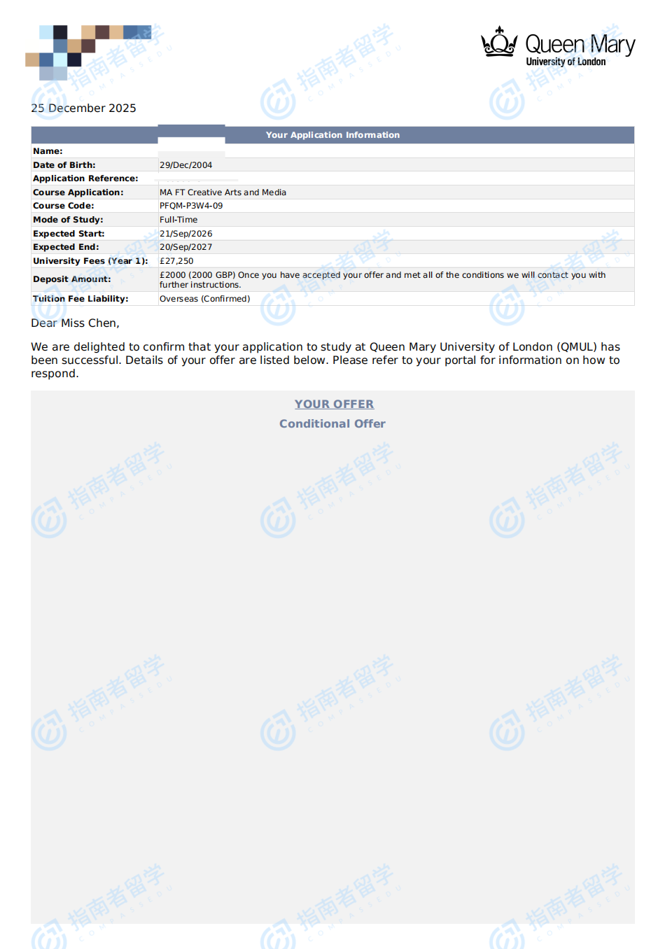 倫敦大學(xué)瑪麗皇后學(xué)院創(chuàng)意藝術(shù)與媒體文學(xué)碩士研究生offer一枚