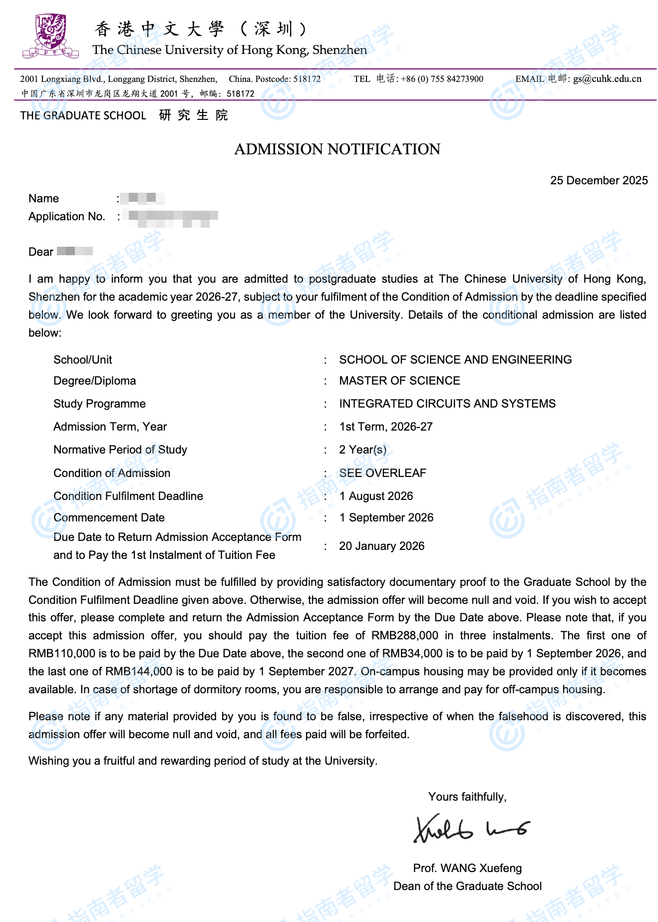 香港中文大學(xué)通信工程理學(xué)碩士(CUHK-Shenzhen)研究生offer一枚